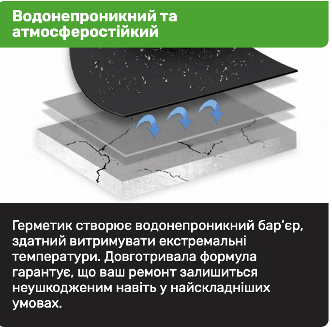 Забудьте про складні інструменти та дорогі виклики майстрів. Лише одне нанесення створює міцне, еластичне та повністю водонепроникне покриття, яке зупиняє потік води та запобігає подальшому руйнуванню від вологи, зберігаючи ваші нерви та гроші.