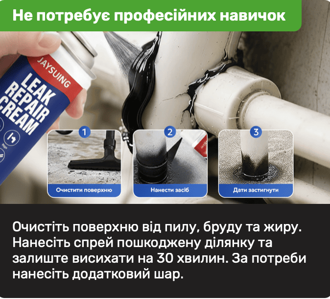 Наш інноваційний спрей-герметик — ваше миттєве рішення для надійного захисту від протікань. Створений для негайної дії, він ідеально підходить для екстреного ремонту у ванних кімнатах, на кухні, для герметизації труб, стін та будь-яких інших поверхонь.