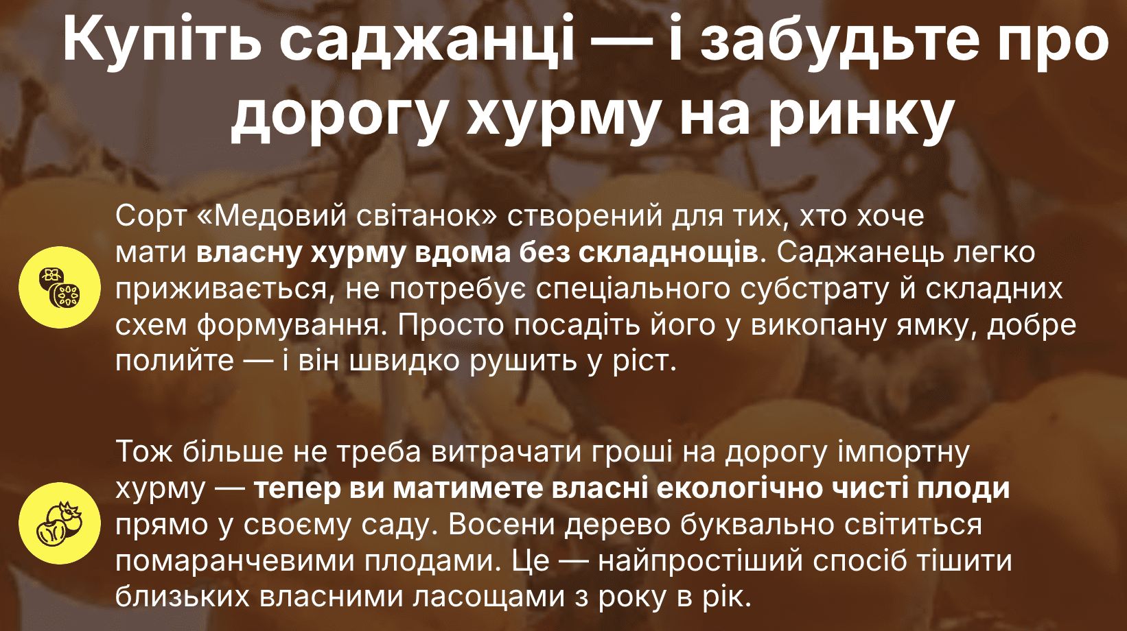 «Медовий світанок» створений для тих, хто хоче не просто врожай, а яскраву осінню насолоду. Плоди мають насичений помаранчевий колір, медово-солодкий смак без терпкості й тонку ароматну шкірку. Дерево виглядає декоративно й прикрашає сад своїми яскравими плодами кожен двір