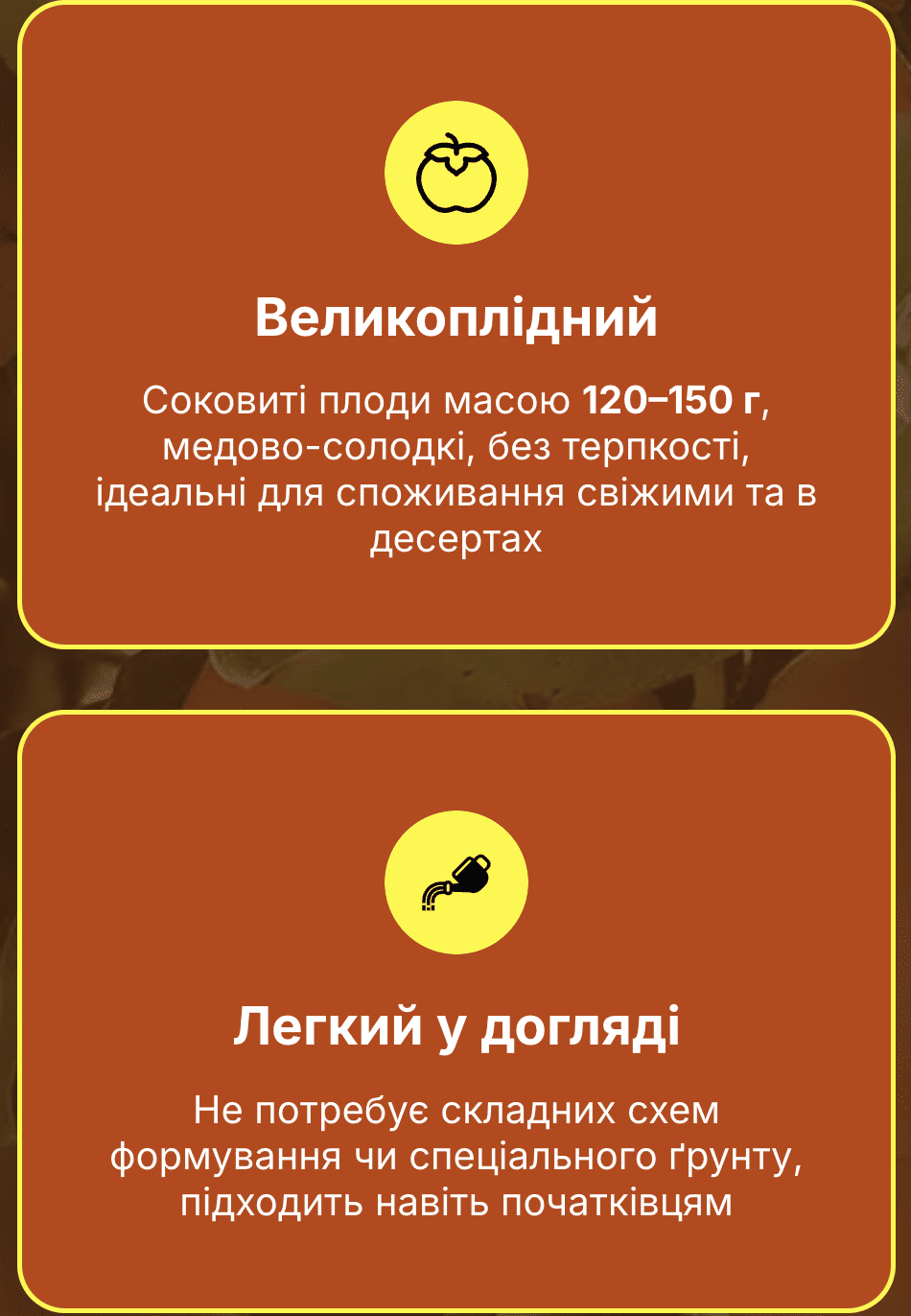 «Медовий світанок» створений для тих, хто хоче не просто врожай, а яскраву осінню насолоду. Плоди мають насичений помаранчевий колір, медово-солодкий смак без терпкості й тонку ароматну шкірку. Дерево виглядає декоративно й прикрашає сад своїми яскравими плодами кожен двір