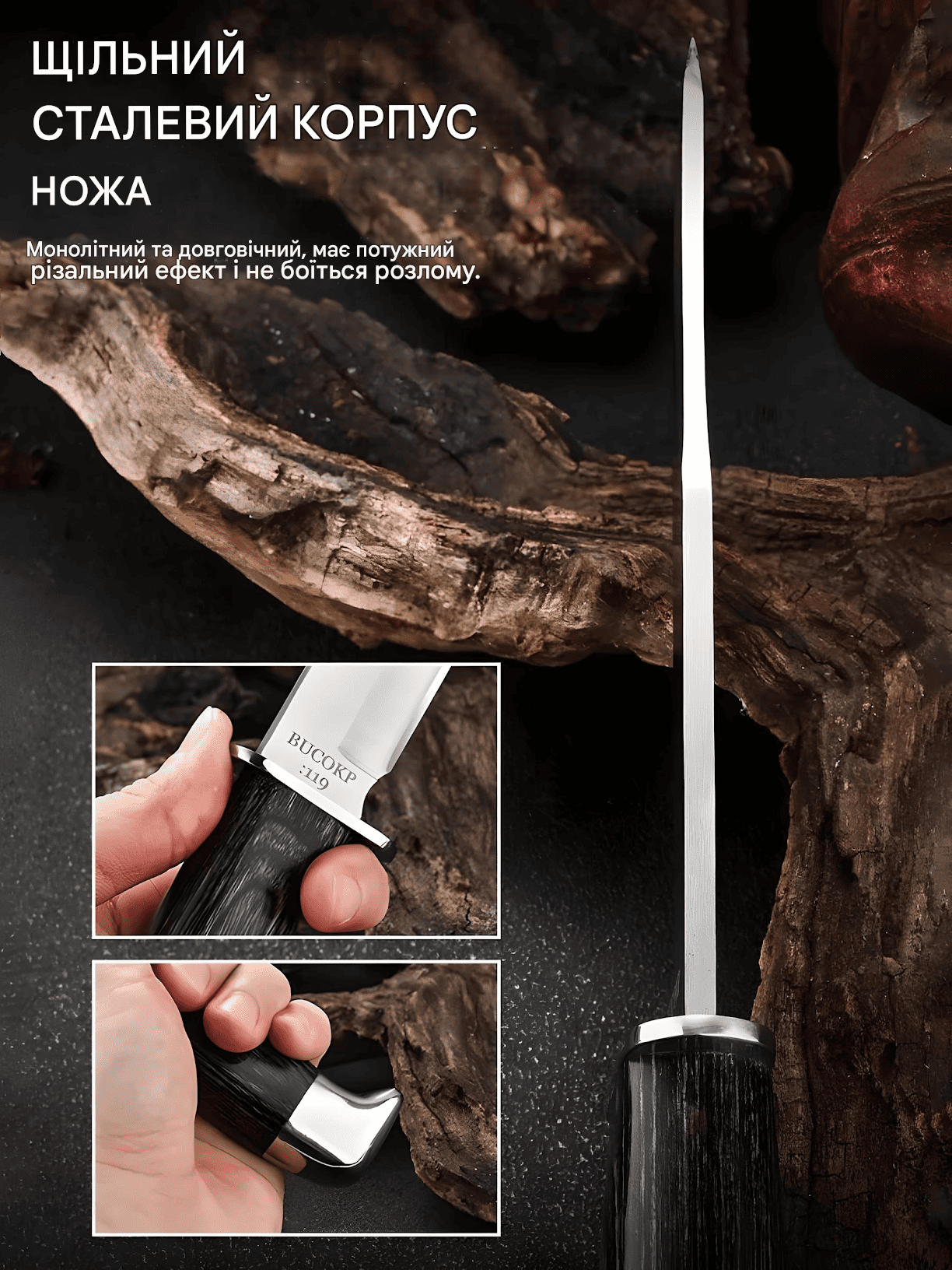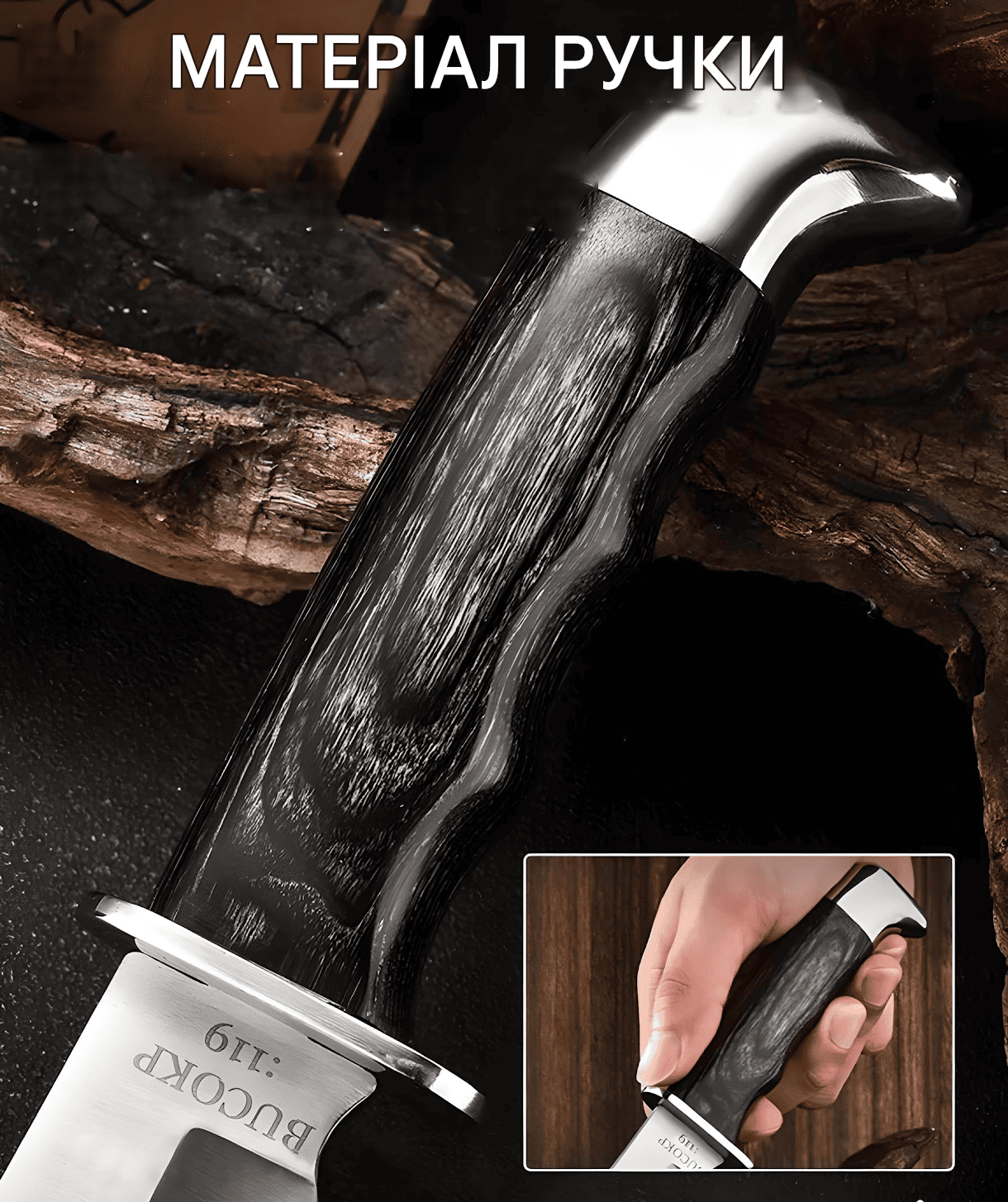 Ніж BUCK 119 має монолітний сталевий корпус з високоякісної сталі 420HC, гострий клинок Clip-point для точних розрізів. Зручна рукоятка з металевою гардою та еко-шкіряні ножни забезпечують комфорт і надійність. Ідеальний для полювання та туризму.