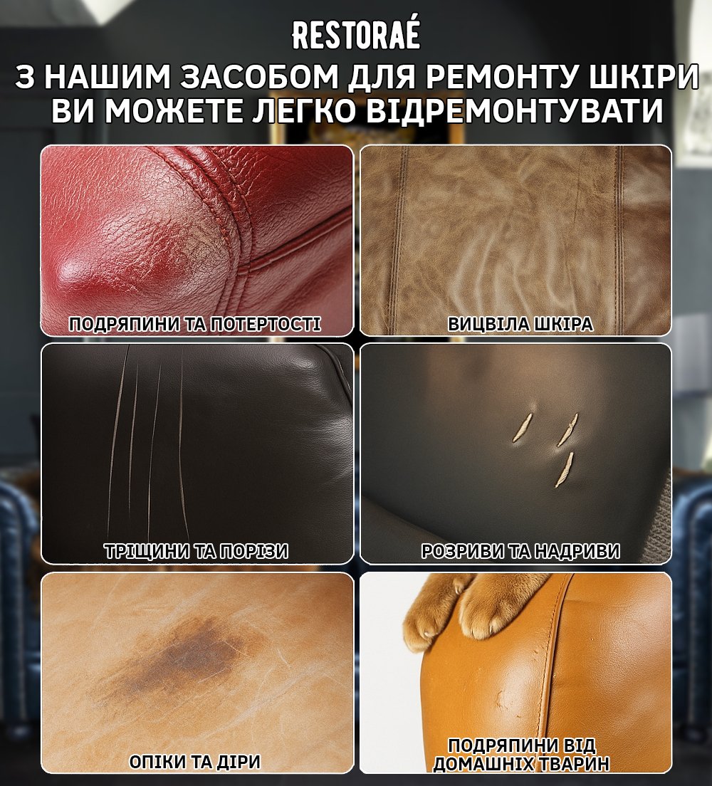 З нашим засобом для ремонту шкіряних виробів Restoraé ви зможете легко повернути первісний вигляд улюбленим речам — без дорогого ремонту чи заміни. Підходить для диванів, автокрісел, курток, сумок, взуття, меблів та будь-яких шкіряних поверхонь.
